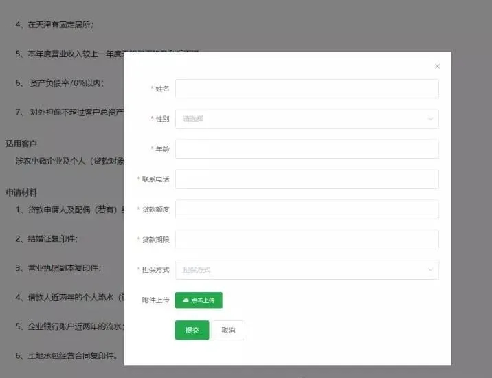 申请人也可通过手机登录天津农村产权交易所微信公众号“信息查询”→“农村金融”进行在线申请。